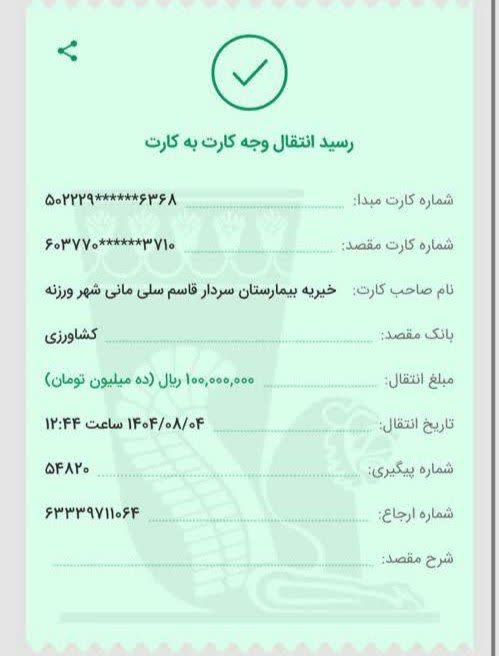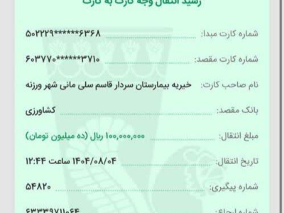 💳 اطلاعات حساب خیریه بیمارستان شهید سلیمانی ورزنه برای مشارکت خیرین محترم در این امر خداپسندانه: